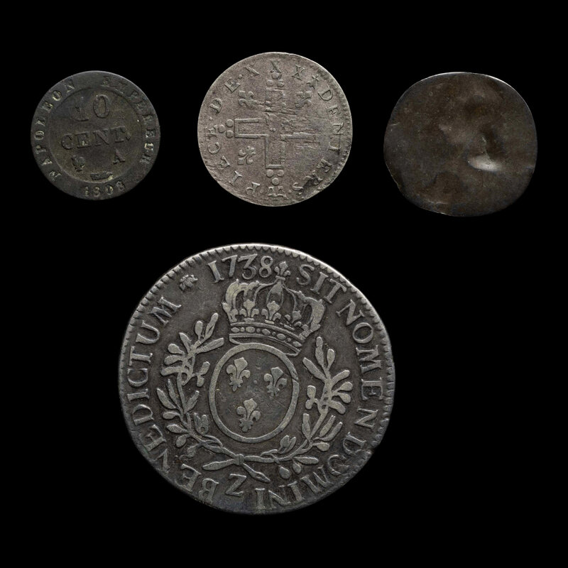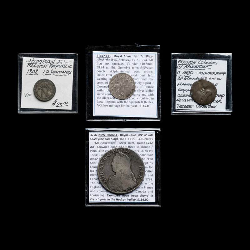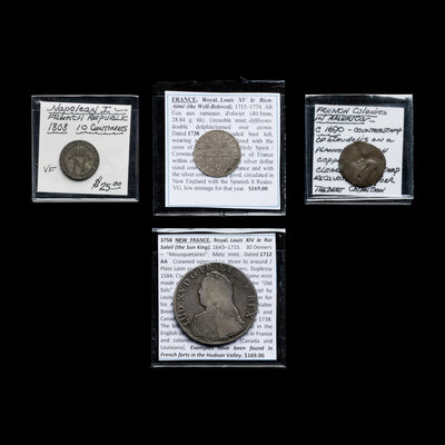 comprising a 1738 Louis XV Silver Ecu, Colonial copper coin stamped with a fleur-de-lis, 1712 New France 30 Deniers and an 1808 Napolein I 10 centimes coin.