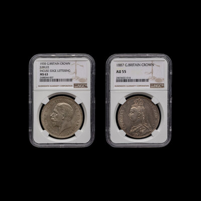 comprising an 1887 Victoria [NGC AU55] and a 1935 George V-Jubilee: Incuse Edge Lettering [NGC MS63] example.