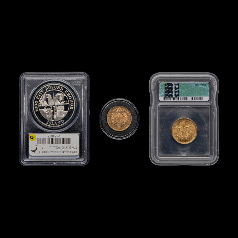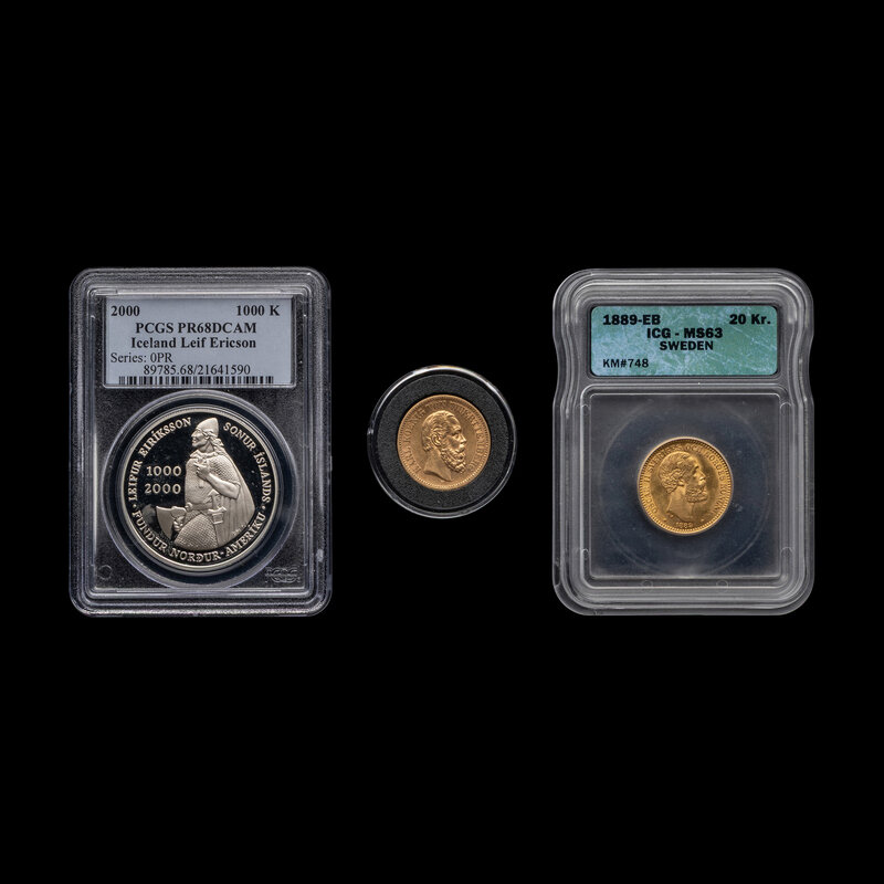 comprising an Germany 1873 20 Mark gold coin, a Swedish 1889-EB 20 Krona Gold Coin and an Iceland 2000 Leif Ericson Commemorative 1000 Kronur Proof [PCGS PR64 DCAM]