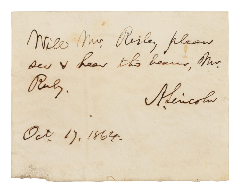 LINCOLN, Abraham (1809-1865). Autograph note signed ("A. Lincoln") to Hanson A. Risley. [Washington, D.C.], 17 October 1864.