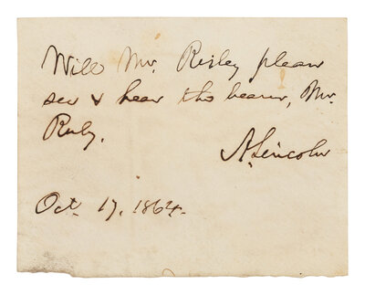 In full: "Will Mr. Risley please see & hear the bearer, Mr. Ruby. A. Lincoln Oct 17. 1864".