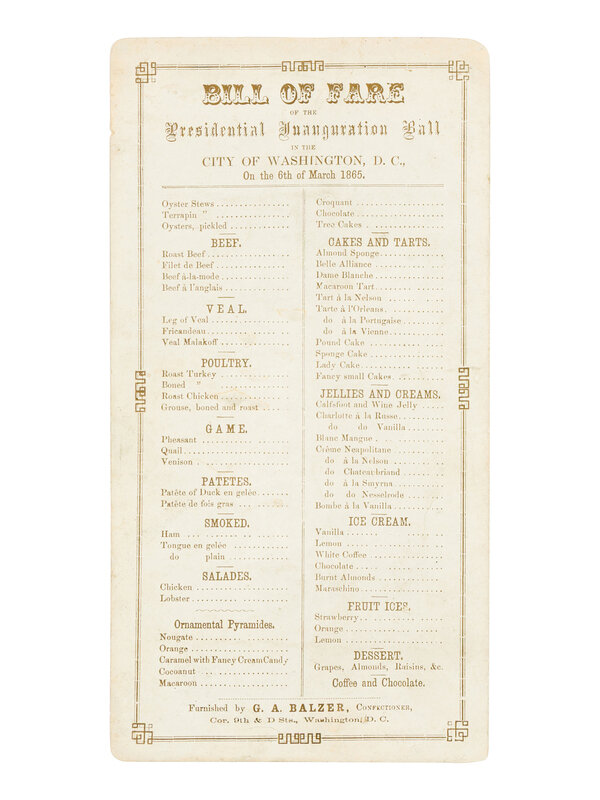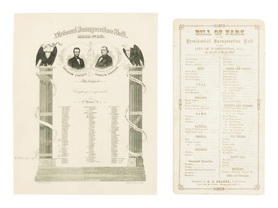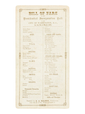 [1865 INAUGURATION]. An invitation and menu to the National Inauguration Ball. Washington, D.C., 4 March 1865.