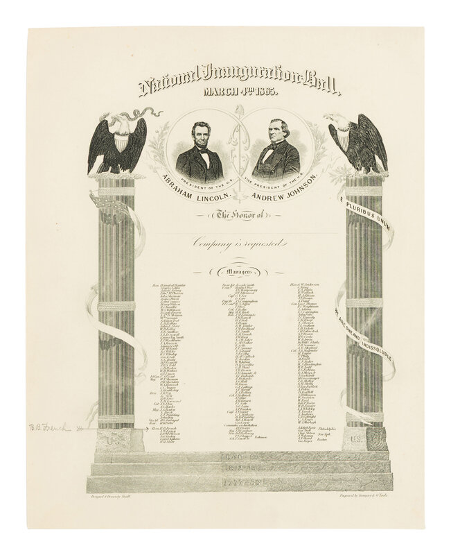 Engraved invitation, with jugate portraits of President Lincoln and Vice President Andrew Johnson, by Dempsey & O'Toole, after Joseph Goldsborough Bruff. 11 x 8 1/2 in. (279 x 215 mm). Unaccomplished; pencil notation in lower left margin ("B.B. French", with penciled arrow pointing to his printed name).
