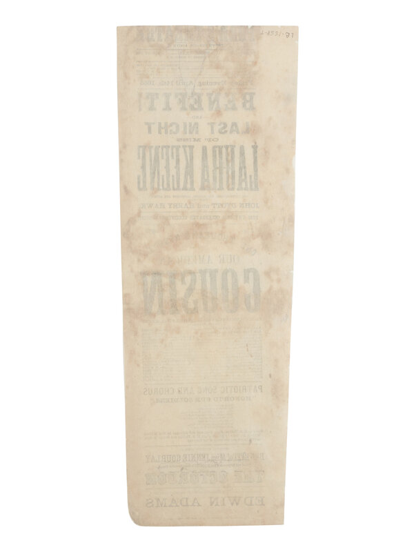 With the addition of "Honor To Our Soldiers" to that night's events, the printing of the playbill was halted, and the standing type was partially reset to provide space to announce this change. Copies carrying the song announcement constitute the second issue, as seen here. On the fateful night, copies of both versions are known to have been in circulation among the audience. Numerous later reprints are distinguishable, some with a spurious insertion announcing the attendance of Mr. & Mrs. Lincoln. For additional details, see Walter C. Brenner, The Ford Theatre Lincoln Assassination Playbills (Philadelphia , 1937) and the Library of Congress Information Bulletin, 6 November 1981.