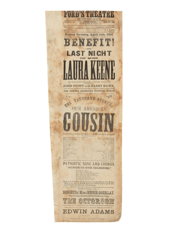 [With:] Printed playbill for the performance of Our American Cousin on 14 April 1865. 19 x 6 3/4 in. (483 x 171 mm). Minor losses along extremities; some soiling and spotting.