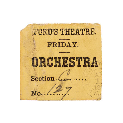 Partially printed ticket stub for Orchestra section C, seat #127, with circular dated stamp showing partially obscured stamp date of Ap[ril] 1[4] 18[65]. Approximately 2.5 x 3 in. (64 x 76 mm); creasing from old folds; wear along extremities; foxing and soiling.
