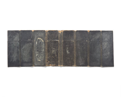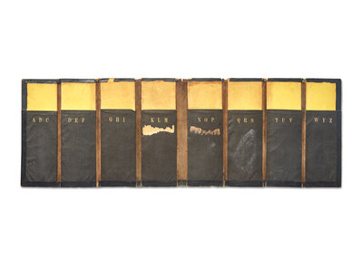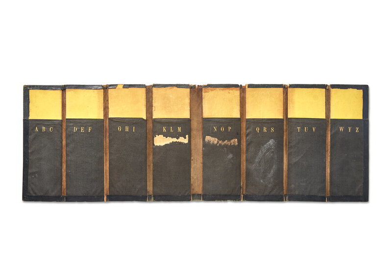 Leather bill book with eight narrow compartments for filing papers, each alphabetized with three gilt letters at top edge; 9 1/4 x 3 3/4 in. (235 x 95 mm) (folded); 9 1/4 x 26 1/2 in. (235 x 673 mm) (open). Rubbing; abrasions; some minor losses to outside cover.