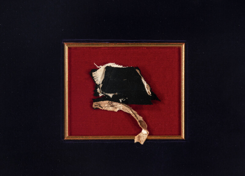 Fragment of Brooks Brothers coat worn by President Lincoln at Ford's Theatre on 14 April 1865; approximately 2 x 3 in. (51 x 76 mm); Unexamined out of framed display, 20 x 16 1/2 in. (508 x 419 mm).