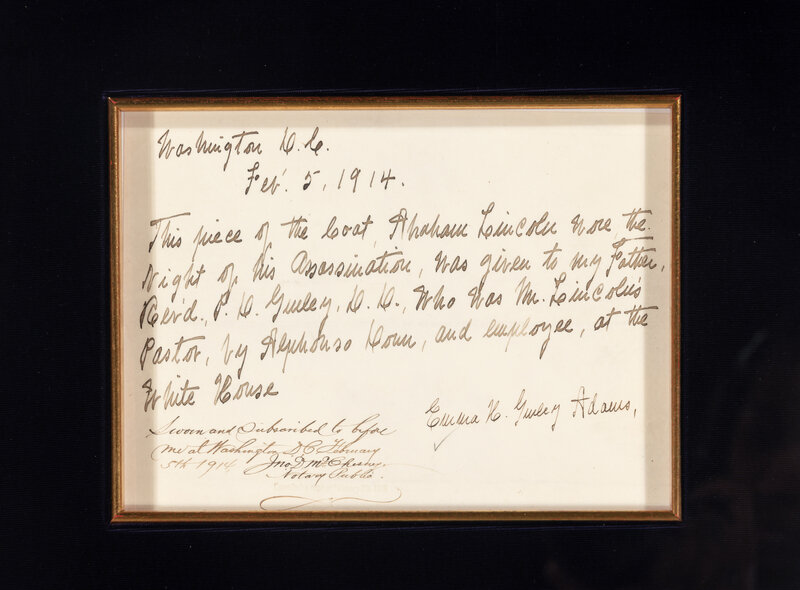 A handwritten note from Gurley's daughter, Emma H. Gurley Adams, dated 5 February 1914, framed here with the coat fragment reads in full: "This piece of the coat, Abraham Lincoln wore the night of his Assassination, was given to my father, Rev'd., P.D. Gurley, D.D., who was Mr. Lincoln's Pastor, by Alphonso [sic] Donn, and [sic] employee, at the White House". This letter is additionally notarized by J. Chesney, notary public.