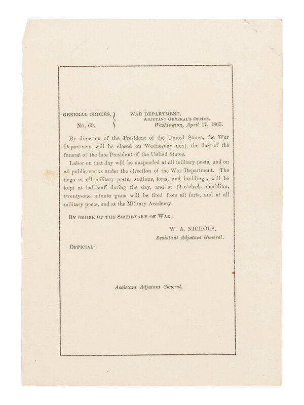 [LINCOLN'S FUNERAL]. NICHOLS, William A. U.S. War Dept. General Orders, No. 69. ... [Washington D.C.: Government Printing Office], 17 April 1865.