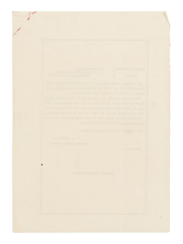 A War Department order announcing a military day of observance for the Funeral of the late President Abraham Lincoln in Washington, D.C. "The flags at all military posts, stations, forts, and buildings, will be kept at half-staff during the day, and at 12 o'clock, the meridian, twenty-one minute guns will be fired from all forts, and at all military posts, and at the Military Academy."