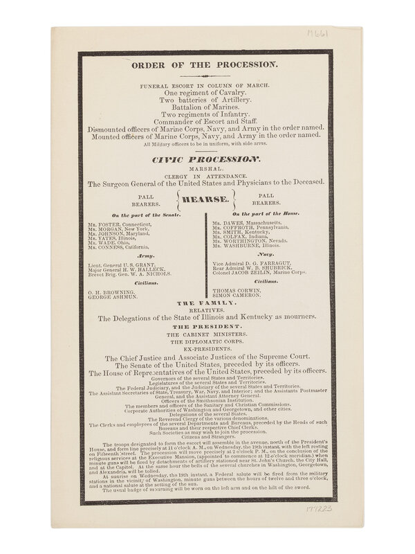 The Procession for Lincoln's Funeral. The The Order of Procession lists the military escort, the civic procession, the hearse with pallbearers, the President's family, various government officials. It also gives instructions for assembling, for the firing of minute guns, the ringing of bells, appropriate attire, and more. Monaghan 661.