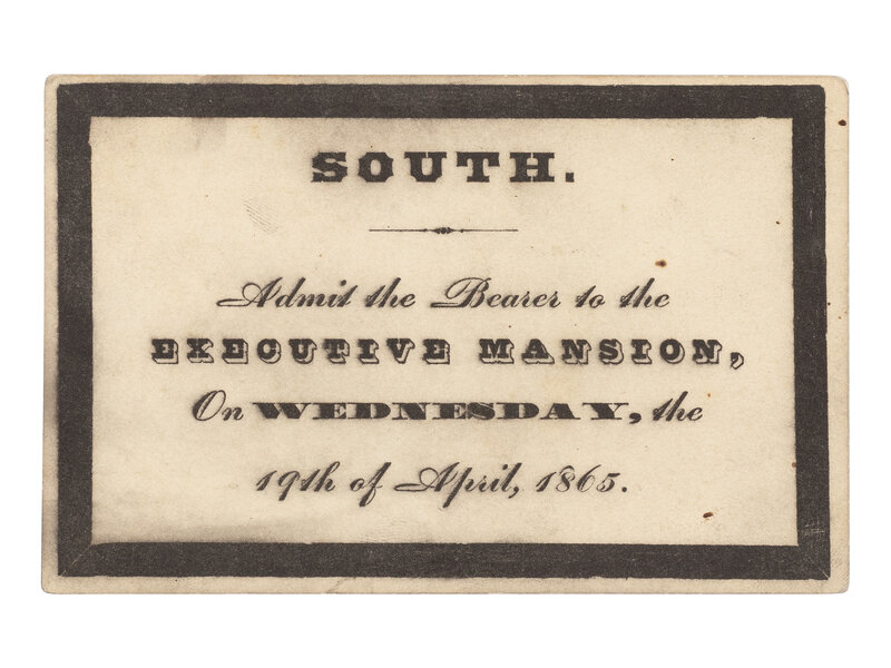 [LINCOLN'S FUNERAL]. A printed admission ticket for Lincoln's funeral. Washington, D.C., Executive Mansion, 19 April 1865.