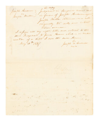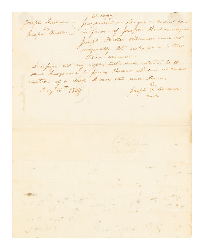 In full: "A Copy Joseph Anderson vs Joseph Miller Judgement in Sangamon Circuit Court in favour of Joseph Anderson against Joseph Miller obtained on a note originally 25 dolls. and interest therein accrued—I assign all my right, titles, and interest to this said judgement to James Adams which is in consideration of a debt I owe the said Adams May 10th 1827 Joseph Anderson his X mark."