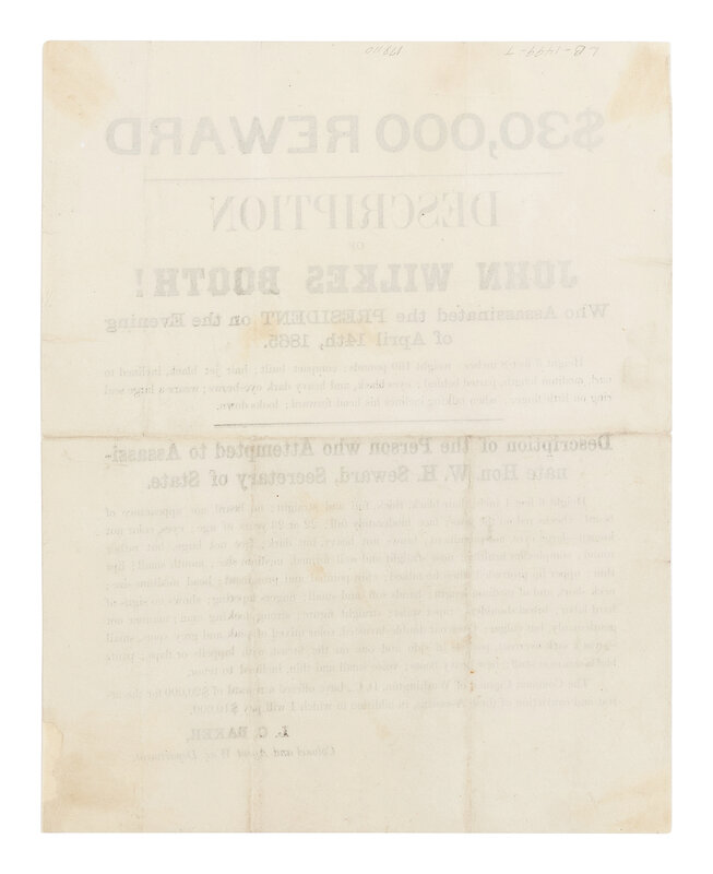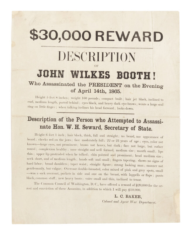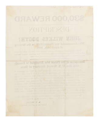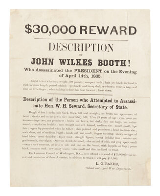 Printed broadside, announcing a $30,000 reward for the arrest and conviction of John Wilkes Booth, and the as-yet unnamed man (Lewis Powell) "who Attempted to Assassinate Hon. W. H. Seward", providing detailed descriptions of both Booth and Powell; 7 3/4 x 9 3/4 in. (197 x 248 mm). Creasing from old folds; repaired tears to bottom right and top left corners; mounting remnants on verso.
