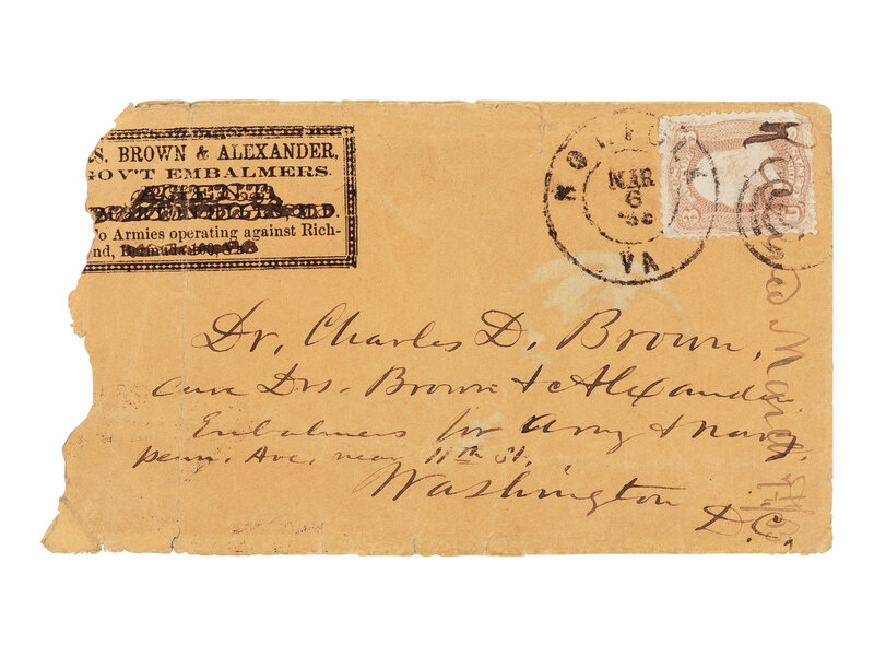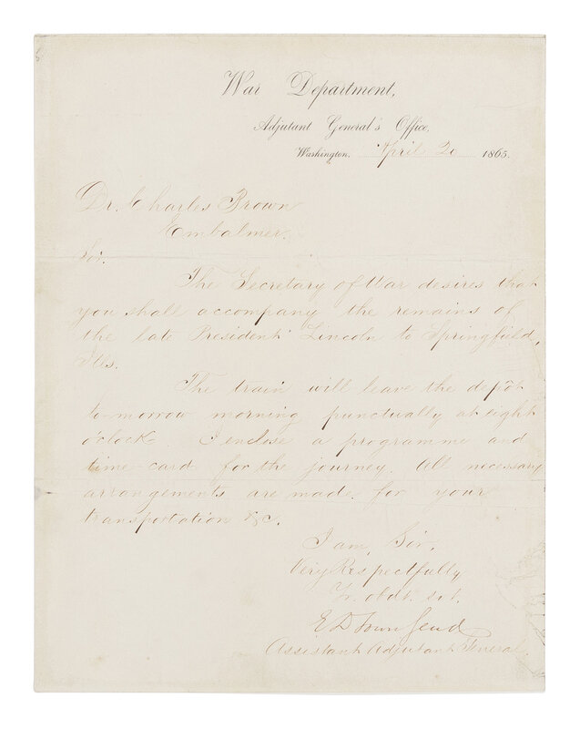 Edward D. Townsend, the logistical planner of the funeral proceedings, would serve as Adjutant General of the U.S. Army from 1869-1880. In this letter he calls upon Dr. Charles Da Costa Brown (1817-96), the preeminent embalmer of Washington, D.C., who had prepared the body of Lincoln's 11 year old son, Willie, in February 1862 after he died of typhoid fever (see lot 83).