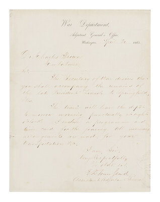 In full: "Sir, The Secretary of War desires that you shall accompany the remains of the late President Lincoln to Springfield, Ills. The train will leave the depot tomorrow morning punctually at eight o'clock, I enclose a programme and time-card for the journey. All necessary arrangements are made for your transportation &c. I am, Sir, Very Respectfully Yr. obdt. svt. E.D. Townsend Assistant Adjutant General".