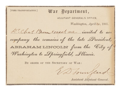 [With:] Official black-bordered War Department pass signed by Townsend, inviting Dr. Brown to accompany the remains of the President: "Dr. Chas. Brown & 1 asst. are invited to accompany the remains of the late President, Abraham Lincoln from the City of Washington to Springfield, Illinois..." 3 x 4 1/4 in. (76 x 108 mm).