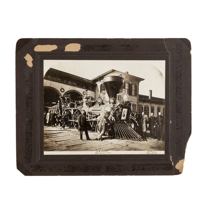 Silver gelatin print, mounted on dark cardstock, 7 1/2 x 9 1/2 in. (190 x 241 mm); overall 11 x 14 in. (279 x 356 mm). Good contrast; very minor spots and blemishes to print; mount with significant losses and tears. Lower margin of photograph with ink inscriptions: "E.S. Flint / Gen. Supt. CC&C" at center, and "TJ Higgins / Train Dispr" at right.
