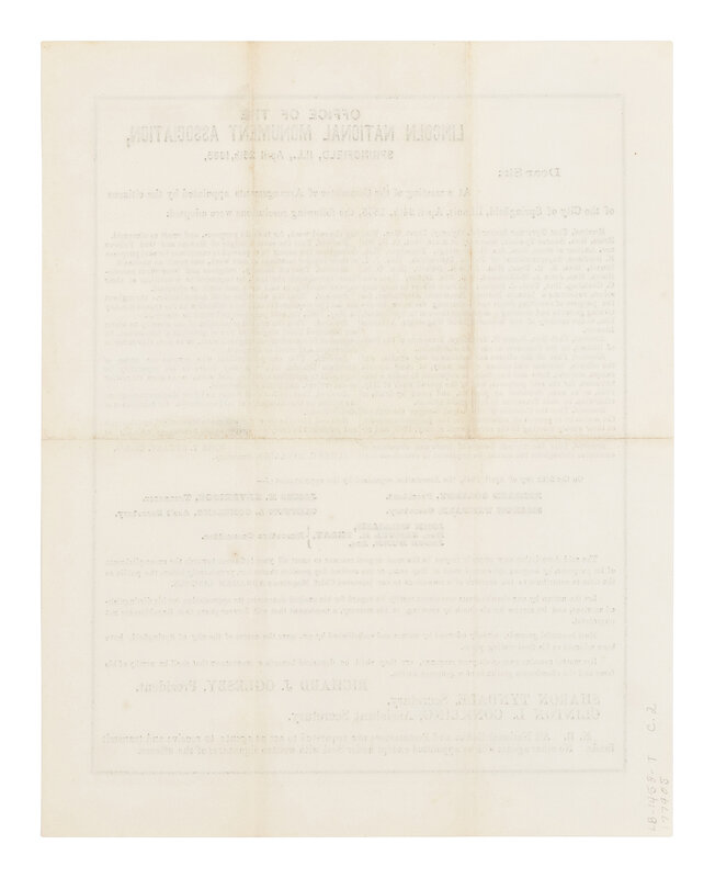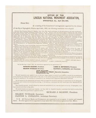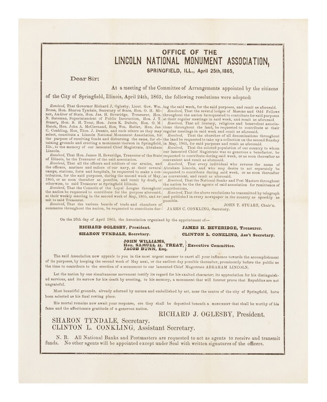 Scarce broadside printing of a letter by Richard Oglesby, President of the Lincoln National Monument Association, transmitting adopted resolutions and announcing the establishment of the Association. Incorporated by an Act of Congress in 1867, the group was instrumental in the planning and construction of the Lincoln Memorial in Washington, D.C., which opened in 1922.