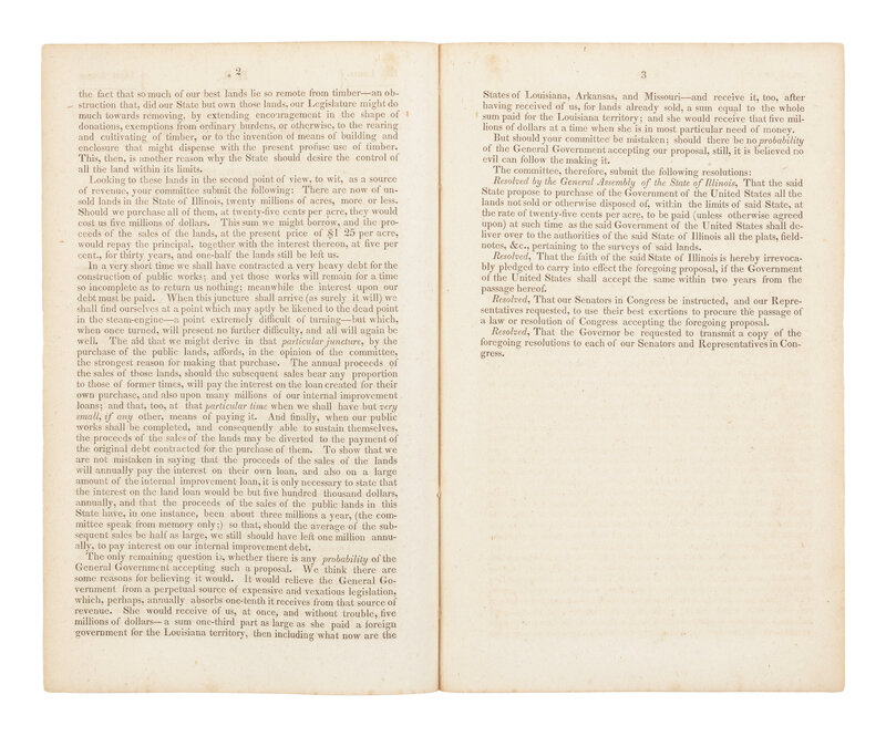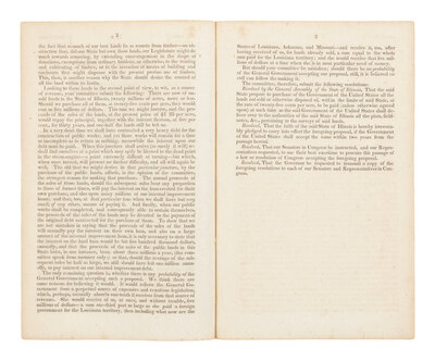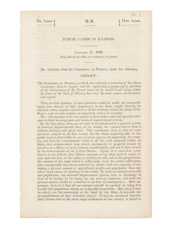 LINCOLN, Abraham (1809-1865). Public Lands in Illinois. January 17, 1839. Read, laid on the table, and ordered to be printed. Mr. Lincoln, from the Committee on Finance, made the following Report... [Vandalia, Illinois], 1839.
