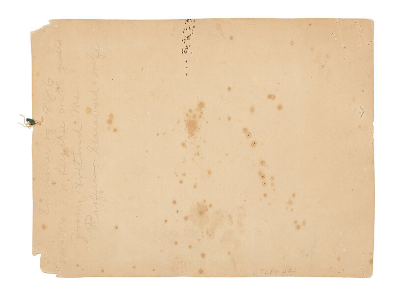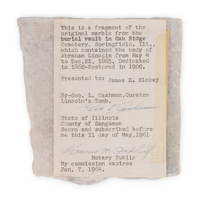 The original receiving vault was restored in 1960. This piece of marble is accompanied on its verso with a typewritten note by George L. Cashman, then-curator and custodian of Lincoln's Tomb, which reads in full: "This is a fragment of the original marble from the burial vault in Oak Ridge Cemetery, Springfield, Ill., which contained the body of Abraham Lincoln from May 4 to Dec. 21, 1865. Dedicated in 1860-Restored in 1960." It is signed by Cashman and countersigned by notary public Frances M. Oakleaf.