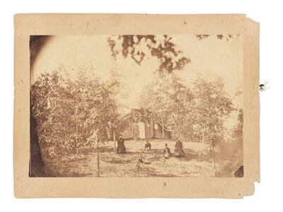A curious pencil inscription appears on the verso, identifying the subjects as "Mr & Mrs H W Larrabee with guests / from Portland Me / Professor Slarabard & Wife". The image is erroneously dated on same, "Summer of 1886". As the pictured tomb was dismantled in the autumn of 1871, this view could not have been captured in 1886.