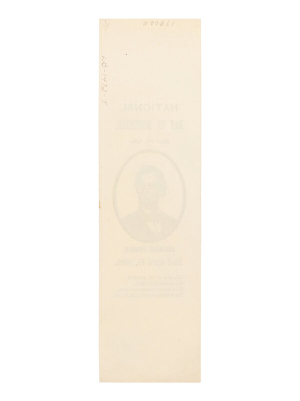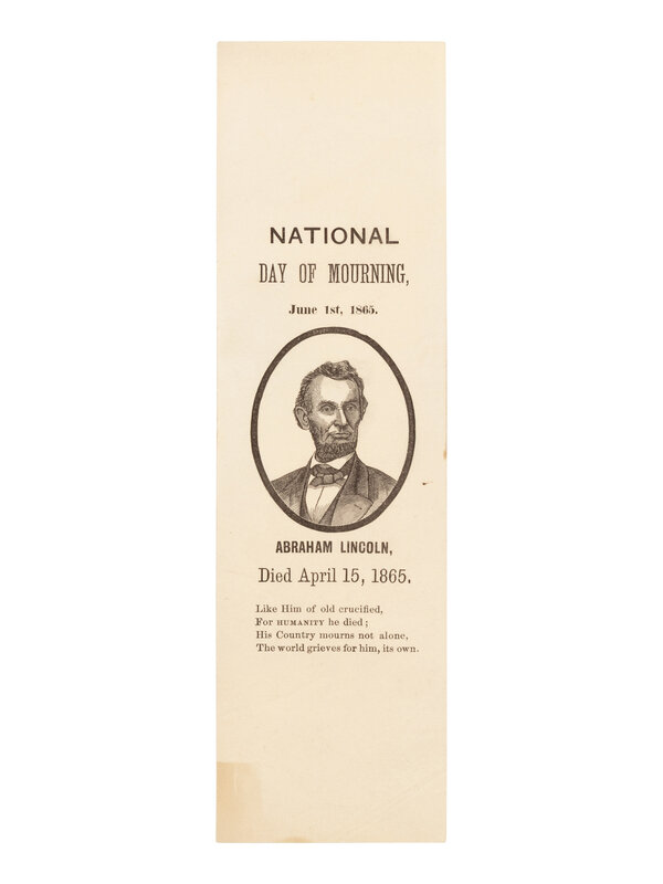 Paper memorial ribbon; 8 3/4 x 2 1/2 in.(221 x 63 mm). Depicting a printed bust portrait of Lincoln at center, surrounded by black mourning border, with, "National Day of Mourning, June 1st, 1865," printed at top, and "Abraham Lincoln, / Died April 15, 1865. / Like Him of old crucified, / For Humanity he died; / His Country mourns not alone, / The world grieves for him, its own.", printed at bottom. Uneven offsetting in bottom left corner.
