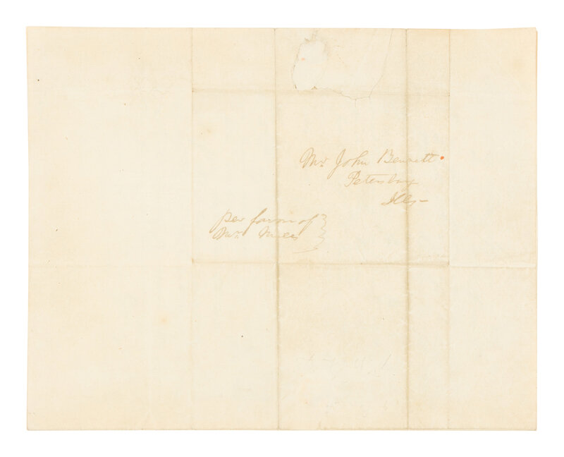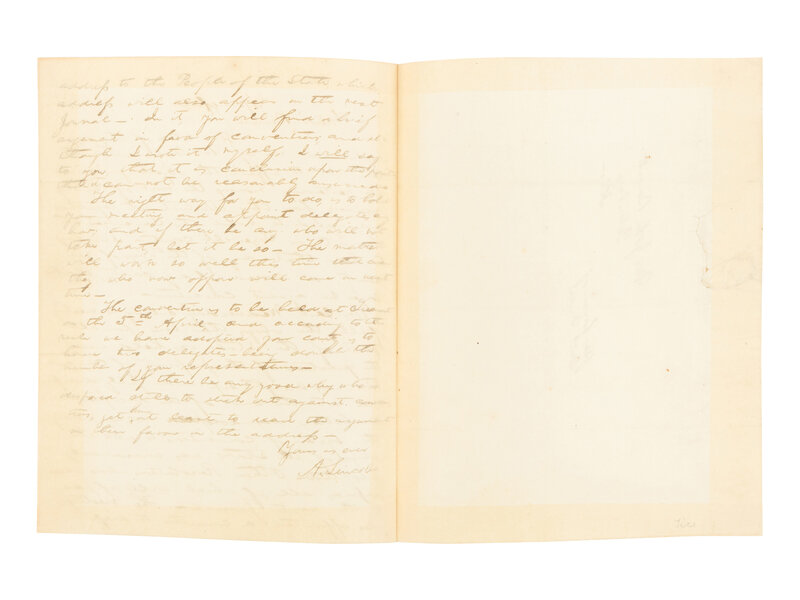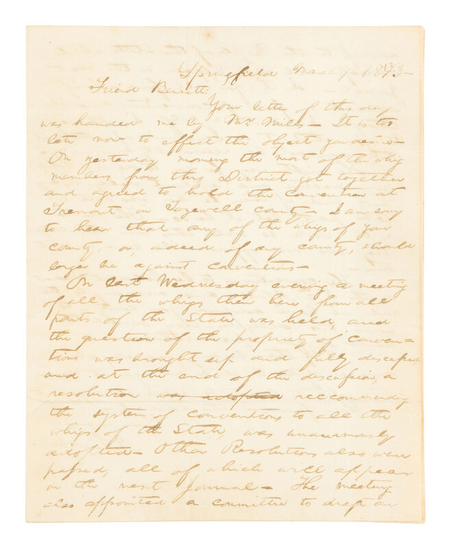 An early political letter relating to Lincoln's first bid for national office--his unsuccessful campaign for the Whig Party's nomination for the 7th Congressional District of Illinois. Lincoln writes to John Bennett (1805-1885), a friend and fellow Whig from Petersburg in Menard County, Illinois (near Lincoln's old home of New Salem), regarding an upcoming convention to choose the Whig party's Congressional candidate. Notably, Lincoln reveals his authorship of the "Address to the People of Illinois", a Whig campaign manifesto issued only three days before this letter, in which he used for the first time the metaphor "a house divided against itself cannot stand": "That 'union is strength' is a truth that has been known, illustrated, and declared in various ways and forms in all ages of the world. That great fabulist and philosopher, Aesop, illustrated it by his fable of the bundle sticks; and he whose wisdom surpasses that all philosophers has declared that 'a house divided against itself cannot stand.'" Lincoln would famously reuse this metaphor to a larger effect, and in a different context, in his House Divided Speech, during his 1858 senate campaign.