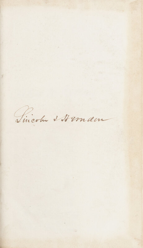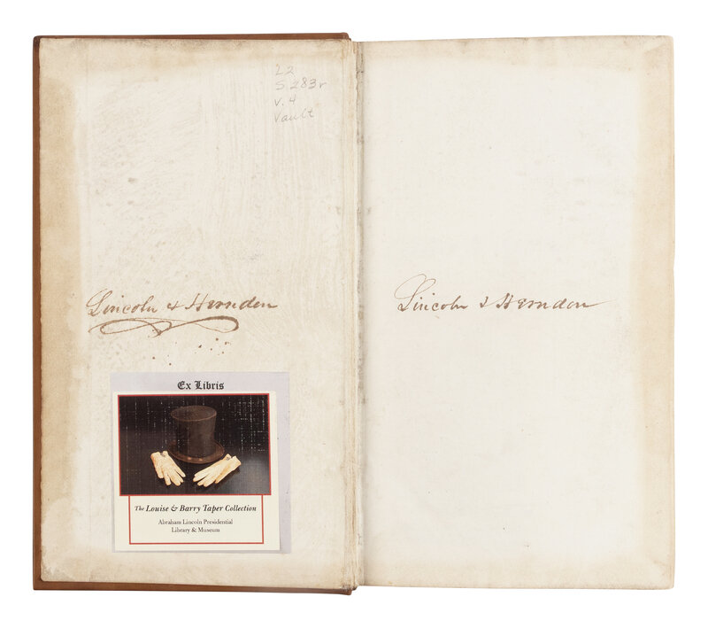 Official reports of cases argued before the Illinois State Supreme Court from 1841-42. Shortly before the publication of this volume, the Court issued a ruling that no book could be removed from their library in Springfield without consent. After hearing about this, Lincoln's law partner, William H. Herndon, began signing the firm's name in every book they owned, so there could be no mistaking it as theirs.