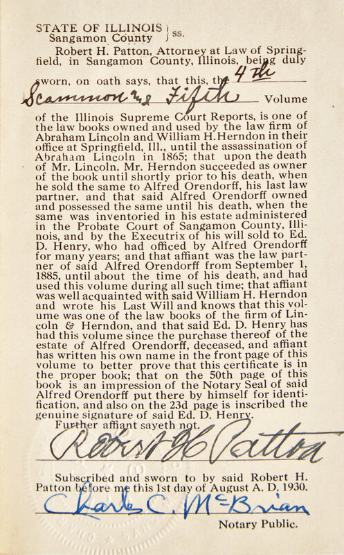 Following Lincoln’s death in 1865, ownership of the building passed solely to William H. Herndon. Shortly before his death in 1891, Herndon sold the practice and its contents to his law partner, Alfred Orendorff (his law office embossed stamp on title-page and p. 50). After Orendorff’s death in 1909, his estate sold it to Ed. D. Henry (ownership stamp on p. 25). In 1930, it was sold to an unknown buyer, as documented in a partially printed affidavit affixed at front, signed by Robert H. Patton, Attorney at Law of Springfield, Illinois, and countersigned by a public notary.