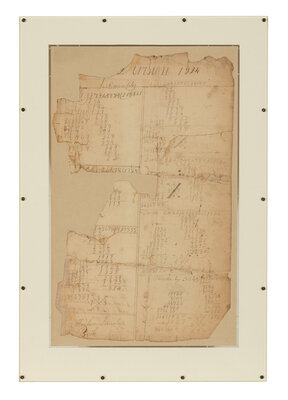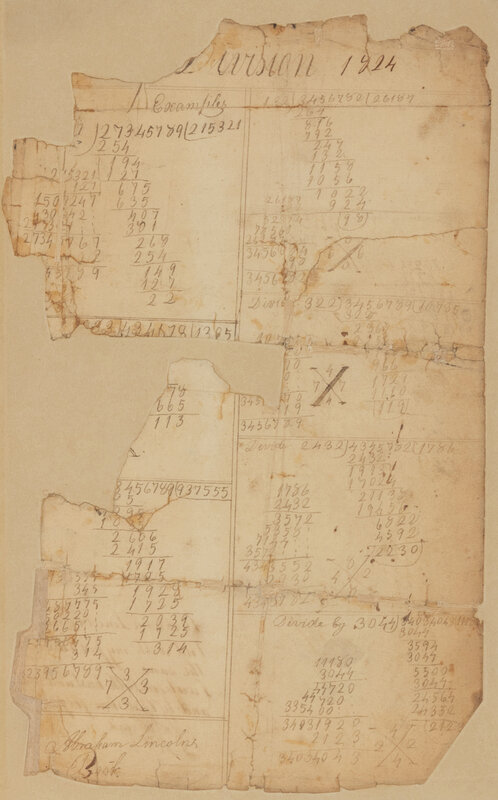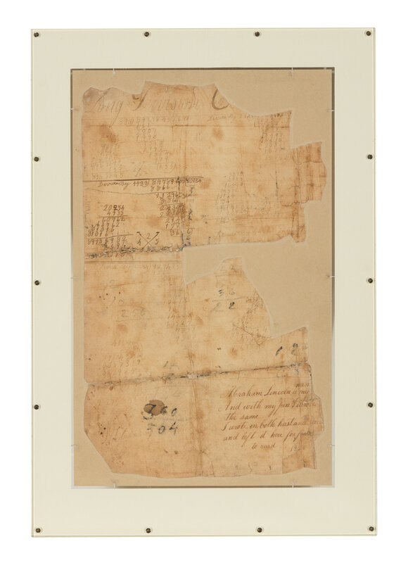 "Sum" or "copy" books were used by children, often on the frontier, where proper textbooks were scarce. The present leaf represents not only the earliest known example of Abraham Lincoln's handwriting but also the value that he placed on a proper education from an early age, albeit with a wry sense of humor thrown in. On the verso, tucked in a corner amidst the sums is a short verse which reads, "Abraham Lincoln is my nam[e] / And with my pen I wrote / the same / I wrote in both hast[e] (sic) and speed / And left it here for fools / to read." The other side of the leaf is headed "Long Division" and is filled with Lincoln's calculations of long division problems and their proofs. In one instance, Lincoln divides 3,456,780 by 132, checking his answer of 26,187 (with a remainder of 98) by multiplying it by 132. The page has five further division problems, all similarly divided and proved. It is signed in the lower left corner, "Abraham Lincoln's Book." This leaf is also the first page from Lincoln's sum book, and appears as the first illustration in Roy P. Basler's The Collected Works of Abraham Lincoln. The 11 surviving leaves have since been dispersed, and we are aware of only one other leaf presently in private hands, the last having been discovered in June 2013. Basler I, p. 1.