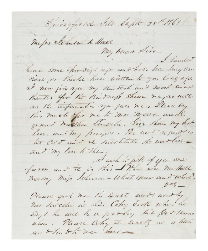 [With]: HERNDON, William Henry (1818-1891). Autograph letter, signed ("W.H. Herndon") to Messrs. Johnson & Hall. Springfield, 28 September 1865. 1 p.; folds; some very minor soiling.