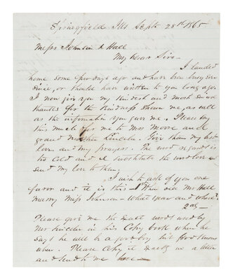 This letter reads in full: "I landed home some four days ago and have been busy ever since, or should have written to you long ago. I now give you my kindest and most sincere thanks for the kindness shown me, as well as the information you gave me. Please say this much for me to Mr. Moore and Grand mother Lincoln. Give them my best love and my prayers...I wish to ask of you one favor and it is this--1st when did Mr. Hall marry Miss Johnson--what year and where? 2nd--Please give me the exact words used by Mr. Lincoln in his Copy book when he says he will be a good boy but God knows when. Please copy it exactly in a letter and send it to me here--3rdly--What is the name of the little town you pass through in going from your house to Charleston--If you know anything I did not get in before such to Mr. Lincoln's life please send it to me--please write it down in a letter and send to me here--Your Friend WH Herndon".