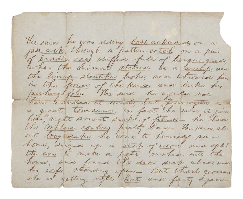 The manuscript comprises a series of "spoonerisms," in which the storyteller transposes the first few letters of a word for humorous effect. In full: "He said he was riding bass-ackwards on a jass-ack, through a patton-cotch, on a pair of baddle-sags, stuffed full of binger-gred, when the animal steered at a scump, and the lirrup-steather broke, and throwed him in the forner of the kence and broke his pishing-fole. He said he would not have minded it much, but he fell right in a great tow-curd; in fact, he said it give him a right smart sick of fitness—he had the molera-corbus pretty bad– He said, about bray dake he come to himself, ran home, seized up a stick of wood and split the axe to make a light, rushed into the house, and found the door sick abed, and his wife standing open– But thank goodness she is getting right hat and farty again–"
