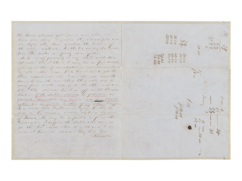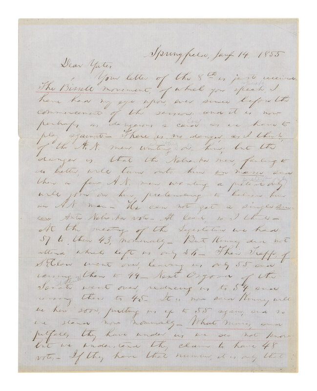 A significant political letter from Abraham Lincoln, written on the eve of his first bid for a United States Senate seat. Showcasing his sharp political sensibilities, Lincoln details to ally Richard Yates the behind-the-scenes politicking for votes as he sought to unseat supporters of Stephen A. Douglas and the Kansas-Nebraska Act: