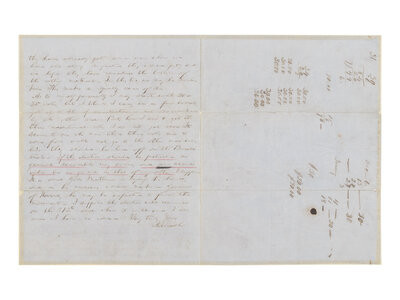 2 pp. on bifolium; 10 x 8 in. (254 x 203 mm); on blue bond paper; recipient's docket on verso integral blank, manuscript financial tabulations on recto of same; silked; creasing from old folds; some text underlined in red pencil; some pencil corrections to text; paper remnants along edge of verso of final leaf.
