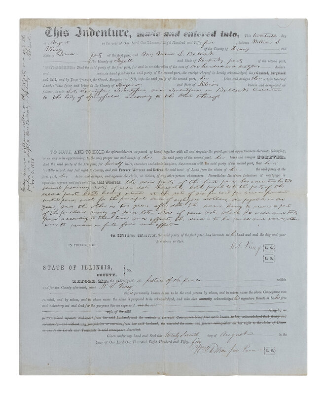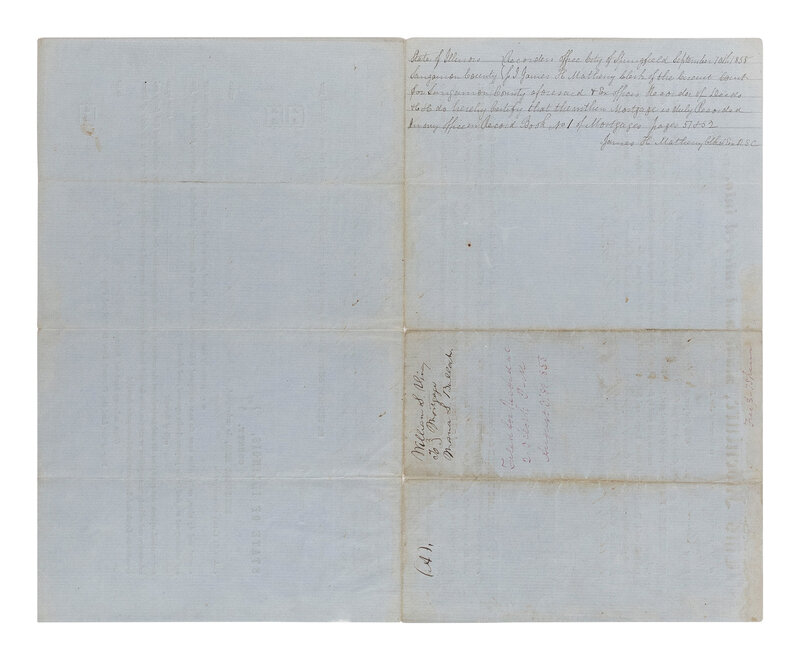3. LINCOLN, et al. Partially printed mortgage deed, signed. Springfield, 20 August 1855. One sheet, 16 x 13 in. (406 x 330 mm), on blue bond paper; creasing from old folds; light toning along same with scattered small separations; soiling at top and bottom edge. Accomplished in manuscript by Lincoln, and with an autograph endorsement by him in top left edge, signed at the bottom by W.S. Viney, lower portion filled in and signed by Justice of the Peace William F. Elkin, certified on verso by Sangamon County Deputy Recorder Benjamin Tallbot, who signed James H. Matheny's name; docketed on verso. Stowell, The Papers of Abraham Lincoln: Legal Documents and Cases, pp. 122-124; LPAL 95309.
