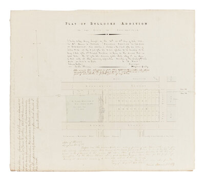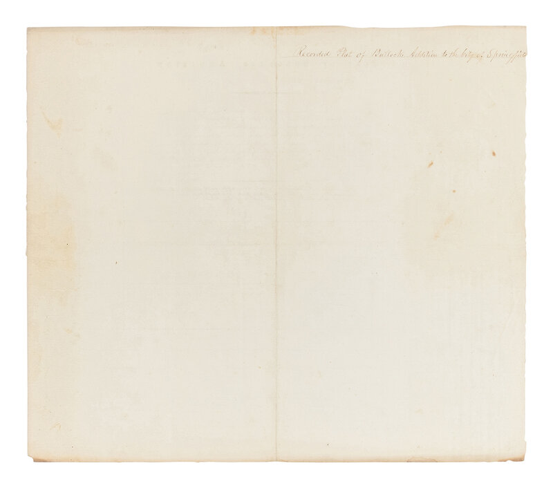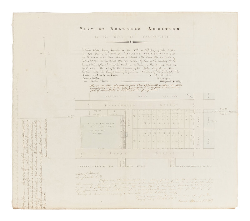 1. LINCOLN, et al. Manuscript plat map. Springfield, Illinois, 4 August 1855. One sheet, 16 3/4 x 19 in. (426 x 482 mm). Docketed on verso. Creasing from old folds; light edge wear. Drawn and signed by Z.A. Enos, Sangamon County Surveyor ("Plat of Bullocks Addition to the City of Springfield"), with a three-line autograph description of the plot by Lincoln in upper center ("The small Lot, shaded in pale blue, apparantly (sic) within the Street immediately East of the City Grave Yard, is excepted, and is not a part of said Street, or private ground of any kind."), and with a nine-line inscription, also by him, at bottom ("State of Illinois Sangamon County Before me the undersigned, an acting Justice of the Peace within, and for the county aforesaid, came Mrs Maria L. Bullock personally known to me to be the real person who procured to be made the above Plat of Bullock's Addition to the City of Springfield, and the Survey...show, and acknowledged said Plat for the purpose of having it recorded according to laws all which I herby certify. Given under my hand and seal this fourth day of August A.D. 1855."), and endorsed by Justice of the Peace Josiah Francis; certified by Sangamon County Deputy Recorder Benjamin Tallbot, who signed James H. Matheny's name. Law Practice of Abraham Lincoln (LPAL) 95307; Hickey, Lincoln the Real Estate Agent (in “The Collected Writings of James T. Hickey”, pp. 19-27; this map illustrated on p. 23).