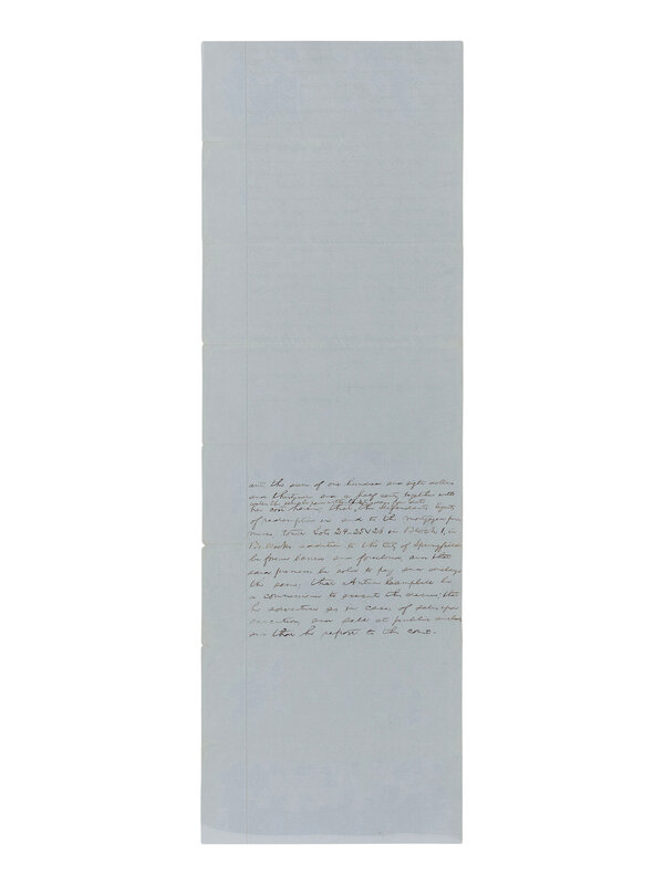 9. LINCOLN. Autograph Document. Springfield, 19 May 1859). One sheet, 25 x 8 in. (635 x 203 mm), on lined blue bond paper; docketed; creasing from old folds. Fully in Lincoln's hand (approximately 43 lines), being a brief summarizing the land transaction and requesting foreclosure and sale of Viney’s property. Stowell, The Papers of Abraham Lincoln: Legal Documents and Cases, pp. 134-135; LPAL 95316.