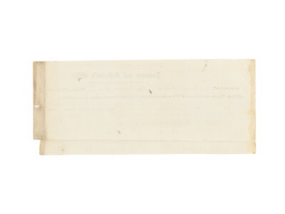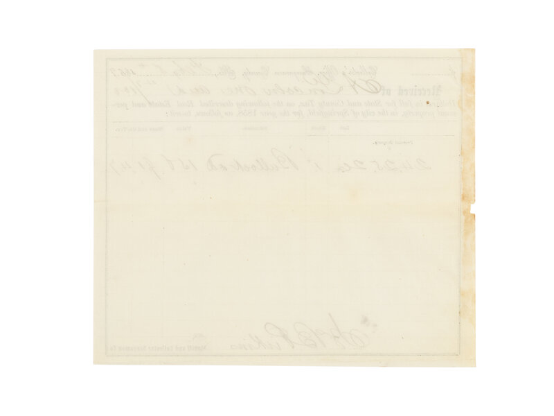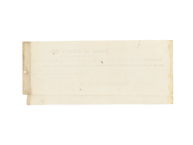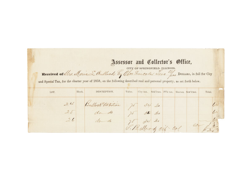 5. Partially printed document. Springfield, 1858. One sheet, 3 5/8 x 8 1/2 in (101 x 216 mm); creasing from old folds; wear and soiling along left and right edges, with wear and some small loss to manuscript bottom right. Accomplished in manuscript in a clerical hand, "Received of Mrs. Maria L. Bullock by Abm. Lincoln Two 52/100 Dollars, in full for City and Special Tax..." LPAL 95315.