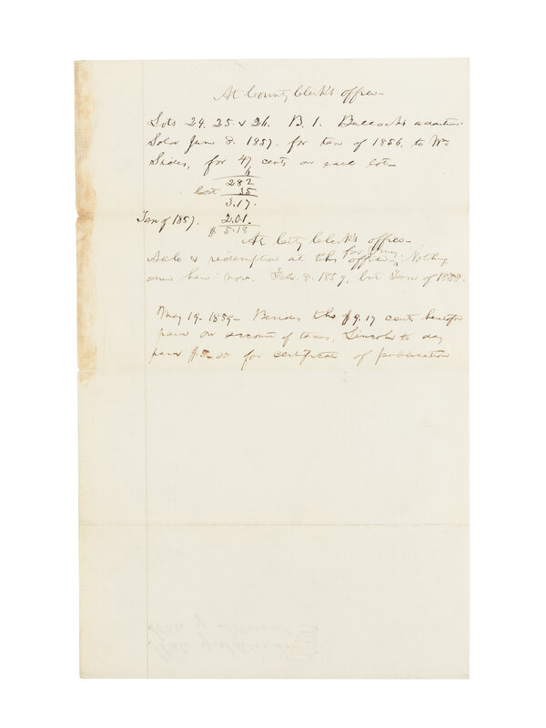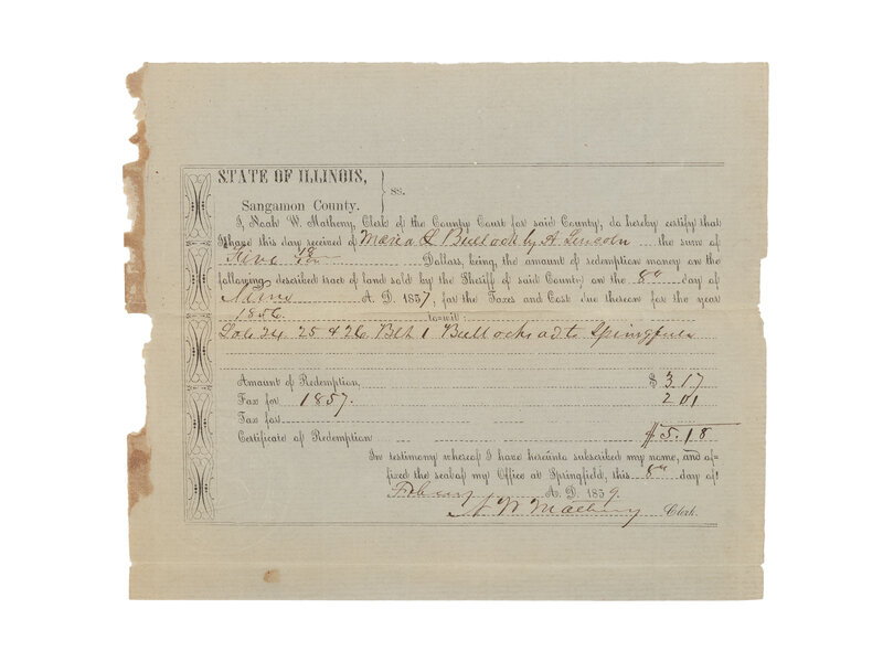 Throughout 1858, Lincoln was consumed with his bid for a United States Senate seat, as well as preparing for and partaking in his historic debates against his rival, Stephen A. Douglas. Following his electoral loss, Lincoln resumed his law practice, and by February 1859 began the process of redeeming Bullock's land and paying the requisite taxes and fees (see items 4, 5, and 6). With the lots now unencumbered, Lincoln filed a foreclosure-of-mortgage suit in the Sangamon County Court against Viney (see item 7) for the money he owed Bullock from the original 1855 purchase. Lincoln was well positioned to handle the matter, as throughout his legal career, he executed nearly 270 similar suits. In February 1859, public notices were published requesting Viney to appear in court that Spring. The case came to trial on May 19, 1859, and Lincoln prepared an accounting of Bullock's redemption of the lots (see item 8). Viney failed to appear, and the land was foreclosed (see item 9). By July, Viney failed to pay the $108 judgment stated above, and the lots reverted to Bullock's ownership. By April 1860, Lincoln had completed selling Bullock's Springfield land--except for the lots represented in this archive--which remained in Bullock's possession until her death, in 1861. In this same period, Lincoln would ascend to national prominence, receiving the Republican Party nomination for president in May 1860, and by the Fall of that year, winning the presidency.