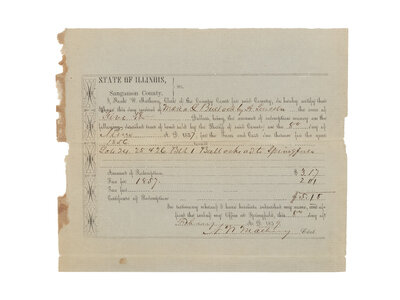 Following the survey, Lincoln then sold the 28 lots at auction, and William S. Viney, a former Springfield resident who then lived in Iowa, purchased three of them. Viney paid with two promissory notes (see item 2), and Lincoln then drafted a mortgage deed detailing the terms of the transaction (see item 3). As per Lincoln's endorsement on that deed, by November 5, 1856, Viney satisfied the first of the two promissory notes. Lincoln then continued to sell Bullock's Springfield property, all the while juggling his other legal responsibilities as well as his increasingly time-consuming political pursuits. By the end of 1856, Viney had become delinquent on property taxes for his lots, and another gentleman purchased them at a tax sale. Per Illinois law, the original owners of the land had two years to redeem their property by satisfying the late taxes plus a premium. In that time, Bullock could redeem the land if Viney failed to complete the transaction.