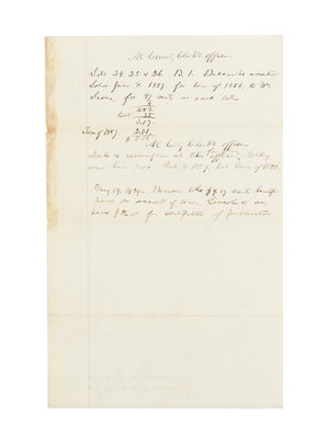 8. LINCOLN. Autograph Document. Springfield, 19 May 1859. One sheet, 12 5/8 x 8 in. (317 x 203 mm); on lined paper; creasing from old folds; soiling in top left edge. Fully in Lincoln's hand (and with his name written in the third person), being an accounting of Bullock's redemption of the Springfield lots. LPAL 95317.