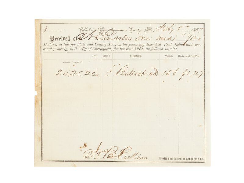 6. PERKINS, J.B. Partially printed document, signed. Springfield, 8 February 1859. One sheet, 6 3/8 x 7 1/2 in. (165 x 190 mm); creased from old fold; soiling along left edge. Collector's Office receipt, signed by J.B. Perkins, Sheriff and Collector of Sangamon County, "Received of A Lincoln one and 47/100 Dollars, in full for State and County Tax..." LPAL 95312.