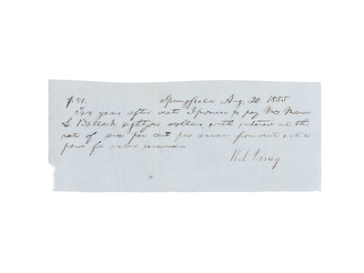 2. LINCOLN. Autograph promissory note. Springfield, 20 August 20 1855. One oblong sheet, 3 1/4 x 8 in. (83 x 203 mm), on blue bond paper; creasing from old folds. Document fully in Lincoln's hand, and signed by W.S. Viney: "Two years after date I promise to pay Mrs. Maria L. Bullock eighty one dollars, with interest at the rate of six per cent per annum from date until paid for value received". Stowell, The Papers of Abraham Lincoln: Legal Documents and Cases, p.121; LPAL 95308.
