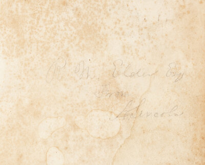 According to the Harry Pratt census (1954) and the Doheny sale errata (1989), the inscription in this copy has been "retraced" in pencil. Upon further analysis, this overwriting only appears to be located in the upstroke of the "A" and in the downstroke of the "L". As the entire inscription is in pencil and is quite light, this could have been done by Lincoln himself.