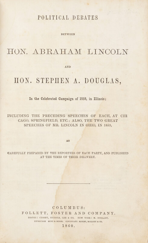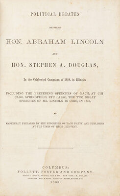 LINCOLN, Abraham (1809-1865) and Stephen A. DOUGLAS (1813-1861). Political Debates between Hon. Abraham Lincoln and Hon. Stephen A. Douglas, In the Celebrated Campaign of 1858, in Illinois... Columbus: Follett, Foster, and Company, 1860.