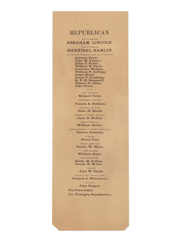 [LINCOLN-HAMLIN CAMPAIGN]. A Republican election ticket for Sangamon County, Illinois, 1860.