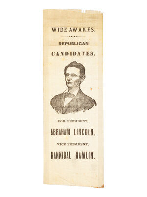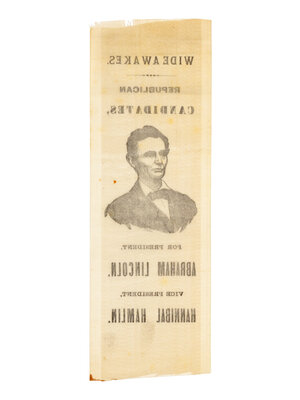 Silk campaign ribbon, featuring an illustrated portrait of Lincoln at center with "Wide Awakes. / Republican Candidates," above and "For President, / Abraham Lincoln. / Vice President, / Hannibal Hamlin." below. 7 1/2 x 2 1/2 in. (192 x 64 mm). Light scattered soiling; very light fraying at bottom; small stain to lower right edge.